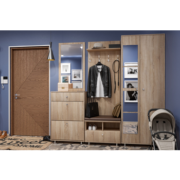 В модульной системе для прихожей, есть несколько вариантов шкафов, тумб и комодов. Все модули между собой сочетаются по цветам и текстурам.
